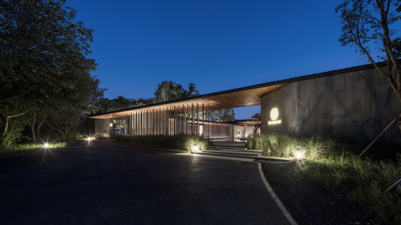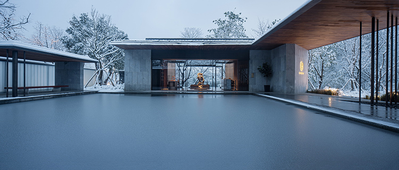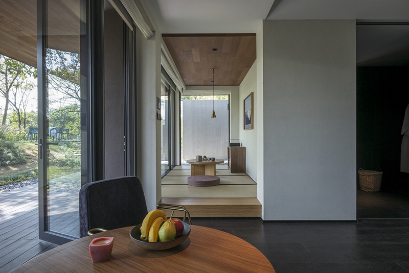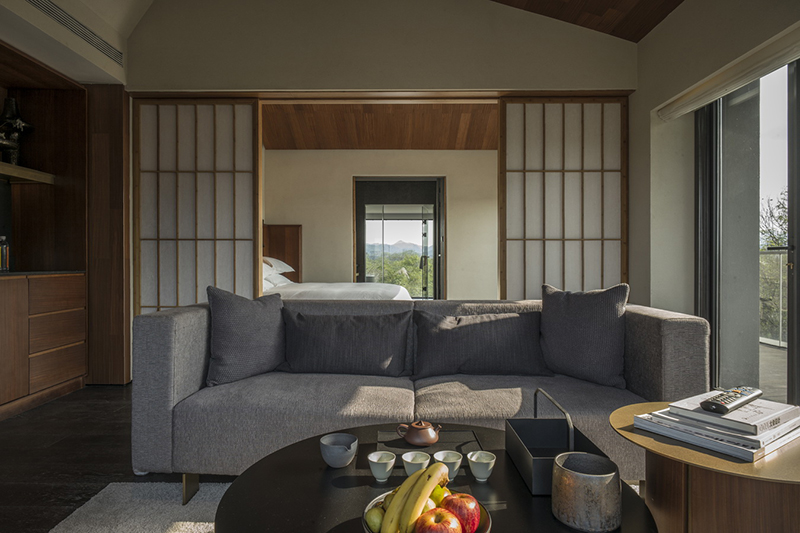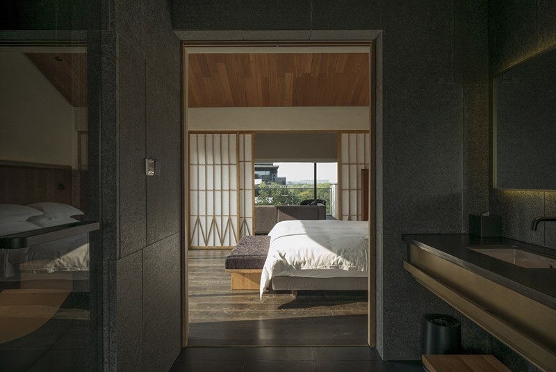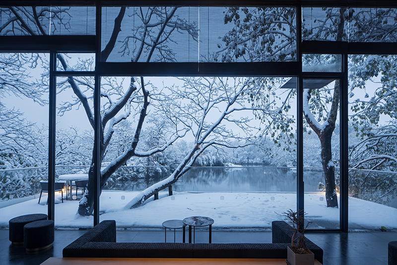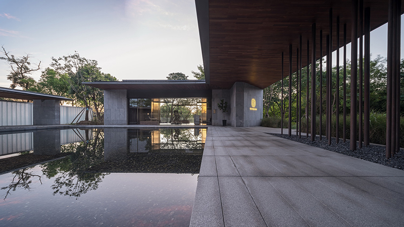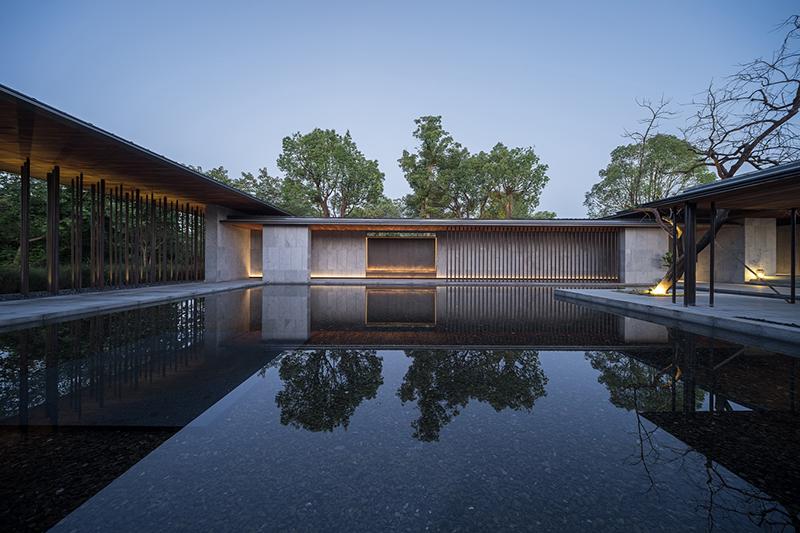 酒店功能布局因地制宜,入口一爿琴臺與柿樹靜立于水院中央,以水平線條連接?xùn)|側(cè)視野開闊的“野堂”與西側(cè)的回廊。