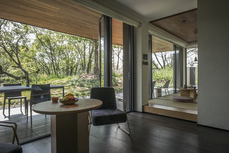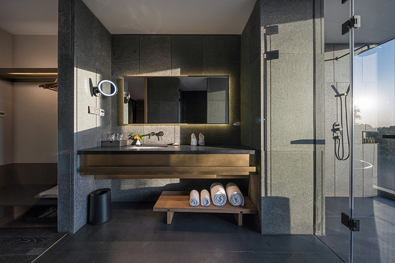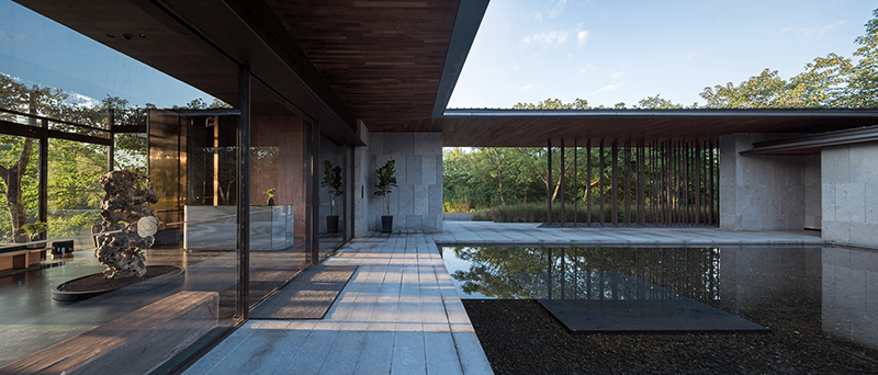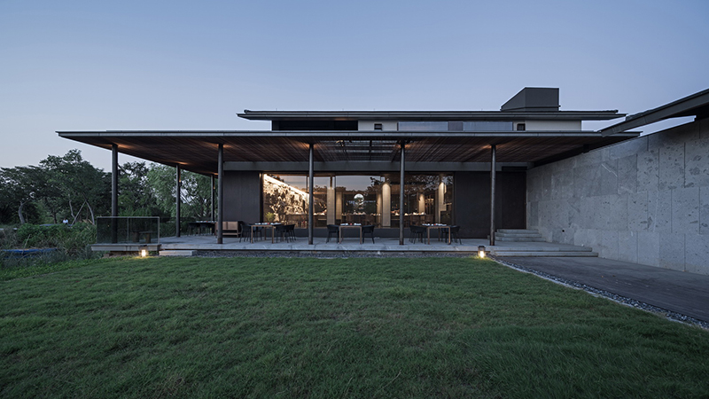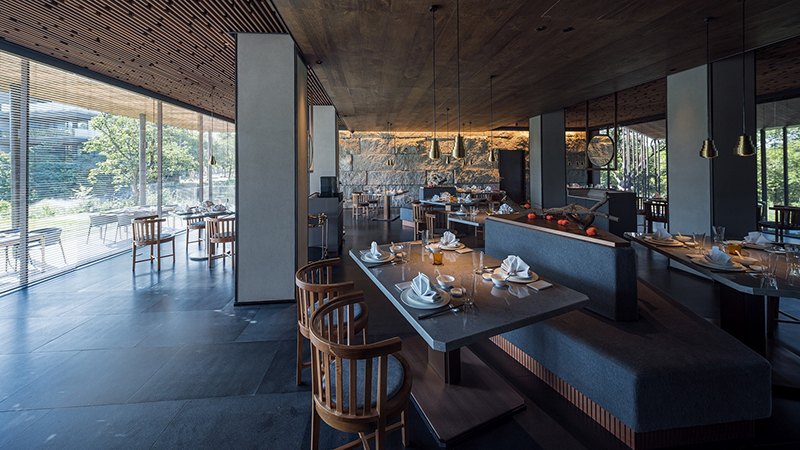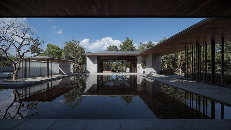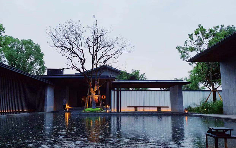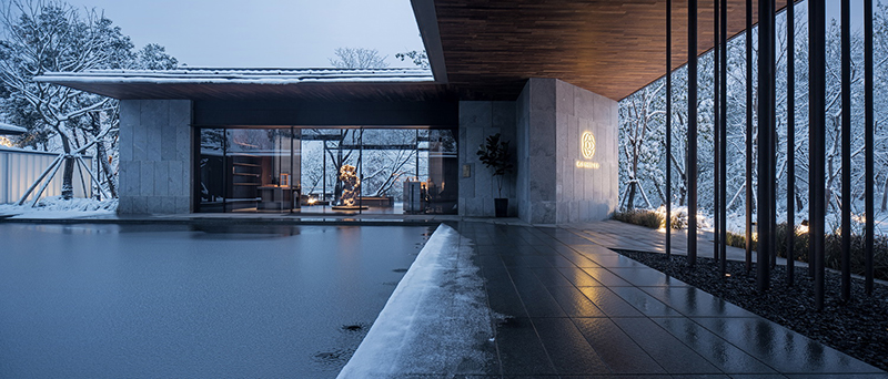 酒店功能布局因地制宜,入口一爿琴臺與柿樹靜立于水院中央,以水平線條連接?xùn)|側(cè)視野開闊的“野堂”與西側(cè)的回廊。