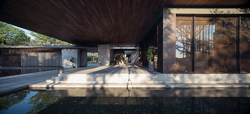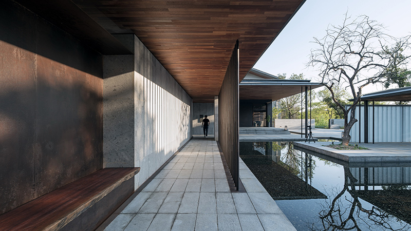 回廊以二度回收的老木板、銹化鋼及水沖面大理石作為主材,設(shè)計師借此將“時間”的概念引入空間——當(dāng)材料的原始色澤和觸感在風(fēng)霜雪雨中緩慢演變,時間的流逝也便記錄在空間的一石一木之中。