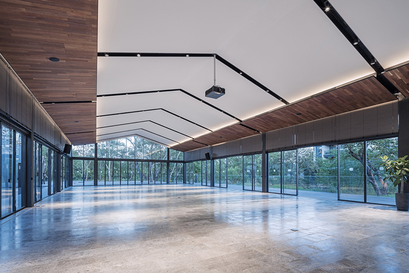 全明宴會廳采用270°落地玻璃,逾300㎡室內(nèi)空間與戶外密林、草坪及親水木平臺自然交融,也為在此舉辦的宴會、服裝秀、車展等活動營造出獨(dú)特的林間體驗(yàn)。