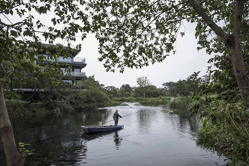 水路流線基于濕地的原始地貌而設(shè)計,使習(xí)慣了陸上出行的現(xiàn)代人群得以沿古水道前往酒店,在搖櫓船徐徐的槳波中,獲得觀察西溪濕地的另一種視角。