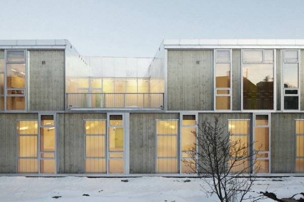 冬季建筑外觀。集成地?zé)岵膳蜔嶙杪矢卟牧系氖褂檬沟檬覂?nèi)冬天十分溫暖。