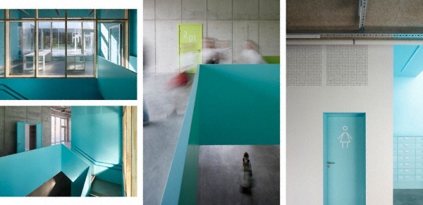 (右)藝術(shù)學(xué)校更衣區(qū)域細(xì)部。各種材料,色彩簡(jiǎn)單明快的和諧共處。導(dǎo)識(shí)系統(tǒng)經(jīng)過(guò)精心設(shè)計(jì)。