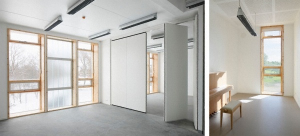 白色調(diào)為主的中性教室。大面積石膏內(nèi)墻,為音樂(lè)教室提供了良好的濕度環(huán)境。