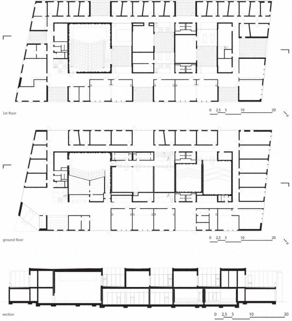 在建筑外圍,練習(xí)大廳和圖書館安排在中心,設(shè)置一系列日光庭院為建筑帶來(lái)自然光線,